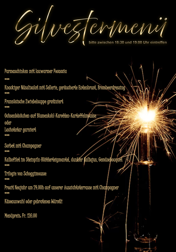 Mittwoch, 31.12.2025 ab 17:00 geöffnet für Silvesterabend (Menue)